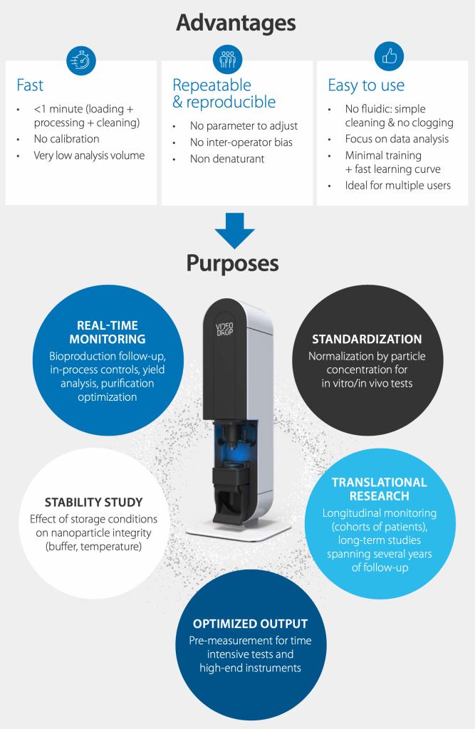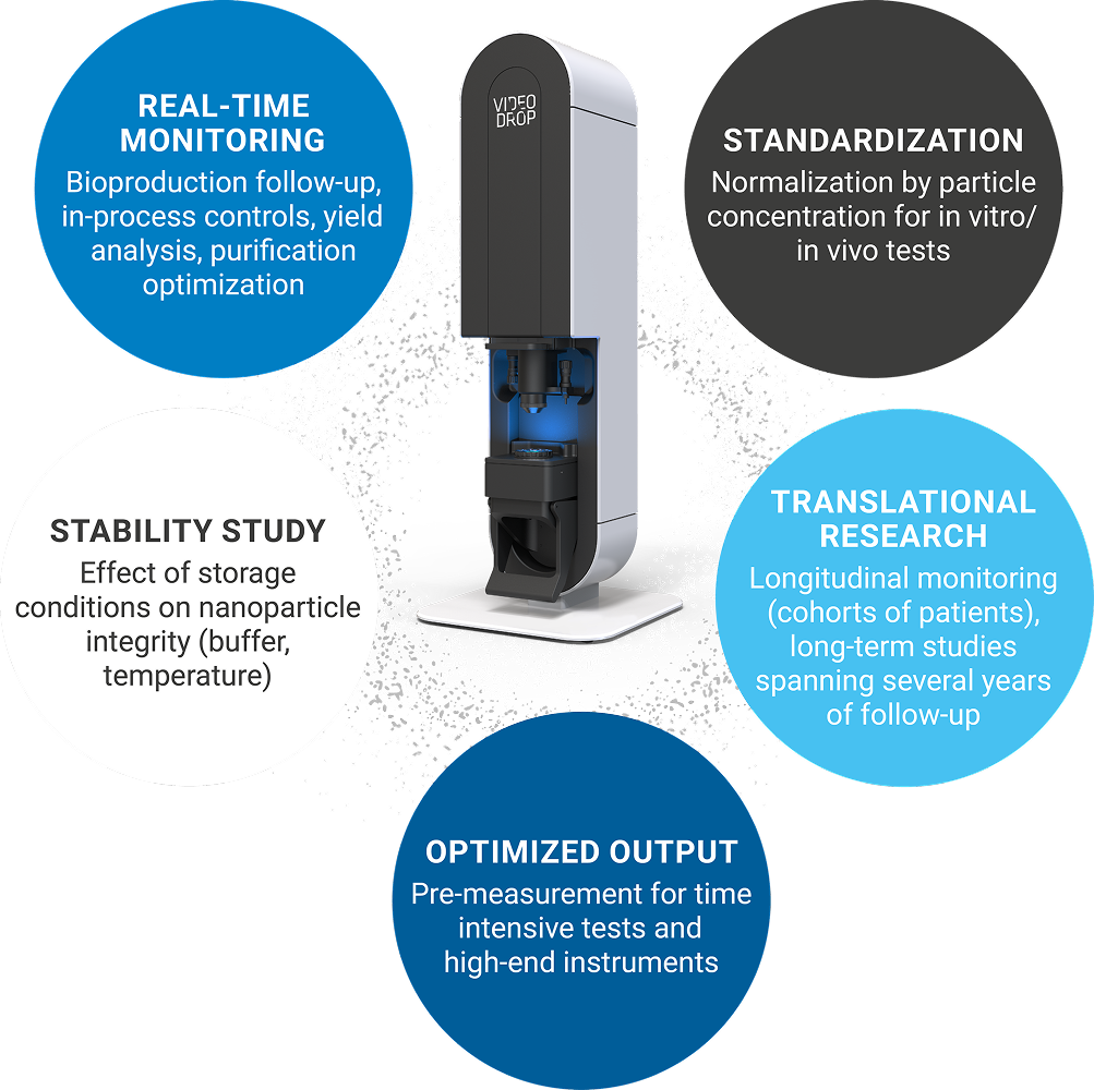 Institute and high-performance software algorithms. It provides the easiest and fastest way to measure nanoparticle size and concentration. Based on Interferometric Light Microscopy (ILM), Videodrop is the ideal tool for scientists working on lentiviral vector (LV) development, extracellular vesicle (EVs) research and production, and lipid nanoparticle (LNP) formulation.