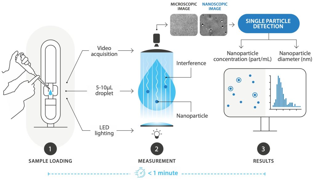 The innovative idea of the scientific team is to have transformed a standard microscope into an interferometer. The nanoparticle solution is illuminated by a simple LED. A high dynamic range camera & images processing algorithms make it possible to detect and track the interferences patterns between the light scattered by the nanoparticles and the incident light signal. The single particle detection allows for accurate measurement of heterogeneous samples.