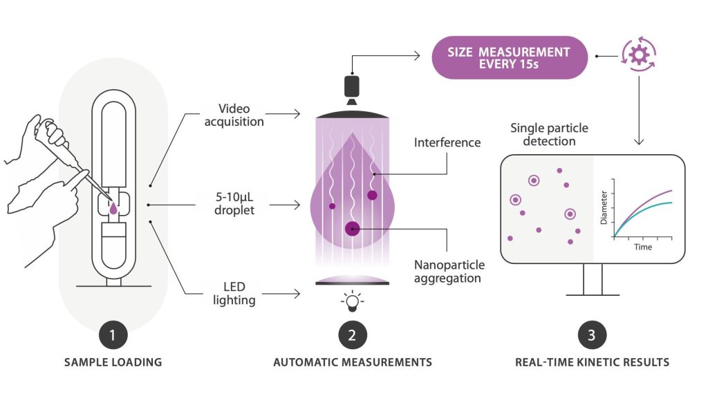 The innovative idea of the scientific team is to have transformed a standard microscope into an interferometer. The nanoparticle solution is illuminated by a simple LED. A high dynamic range camera & images processing algorithms make it possible to detect and track the interferences patterns between the light scattered by the nanoparticles and the incident light signal. The single particle detection allows for accurate measurement of heterogeneous samples. One measure every 15 seconds enables a fine and precise monitoring of size evolution giving information on nanoparticle aggregation and complexation.